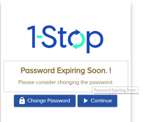Step 2: If your password is expiring in next 5 days a system prompt will be displayed. To change password, click "Change Password" button. If your password has already expired, you will be asked to reset password as shown in Step 3.