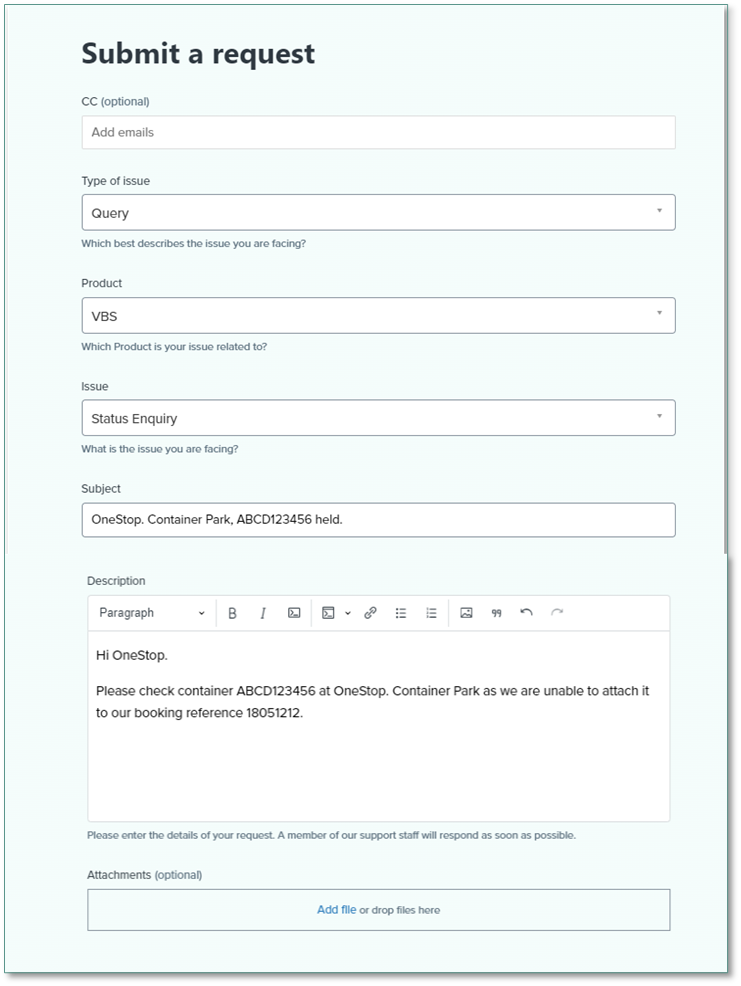 - Description - Describe the issue comprehensively for investigation, including site and container numbers. Specify the assistance required for resolution. Providing clear information expedites the resolution process.