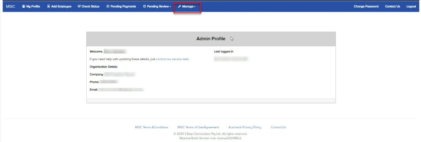 1. Log into your Account using your admin credentials and click ‘Manage' on the menu at the top of the page.